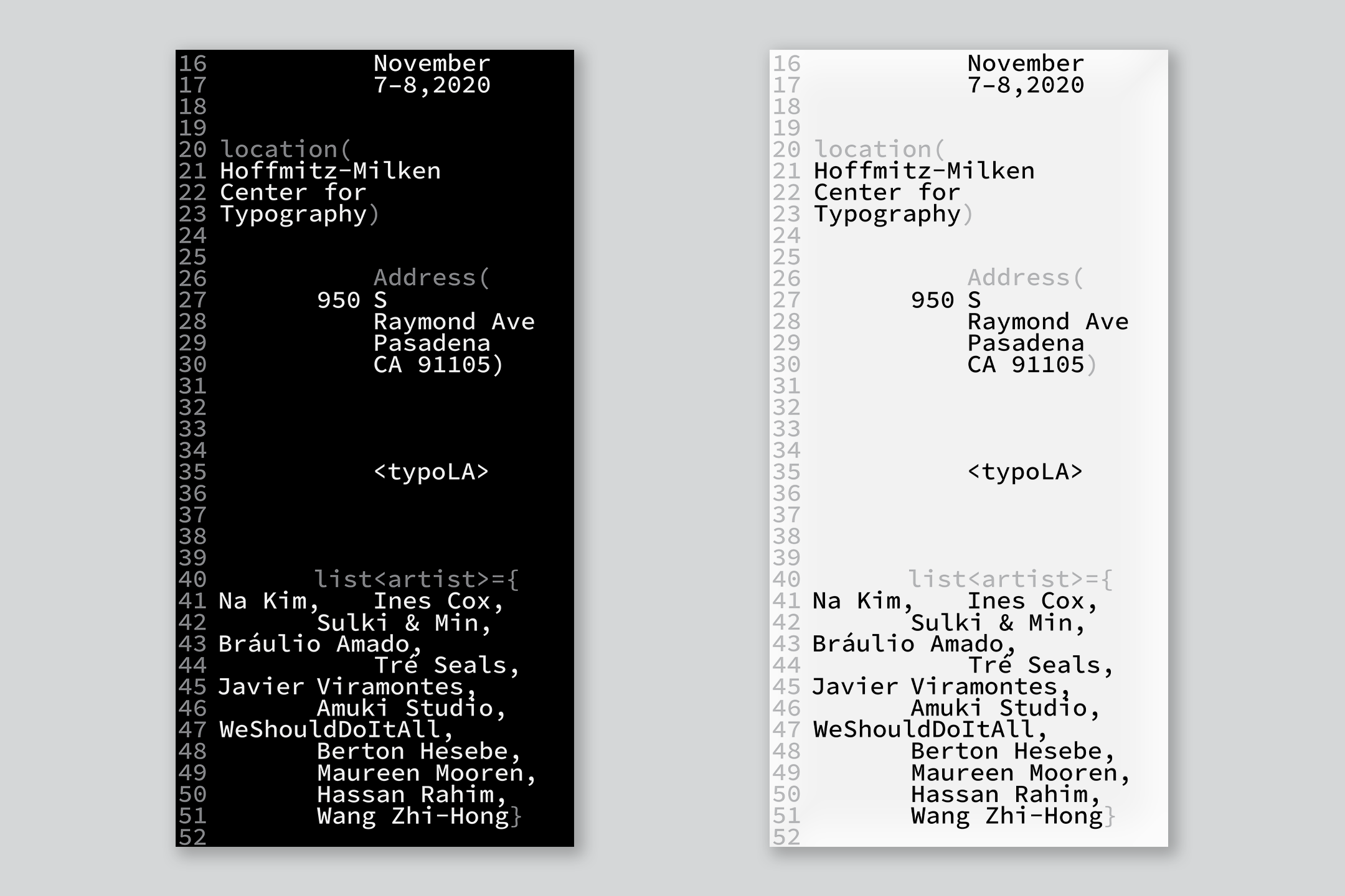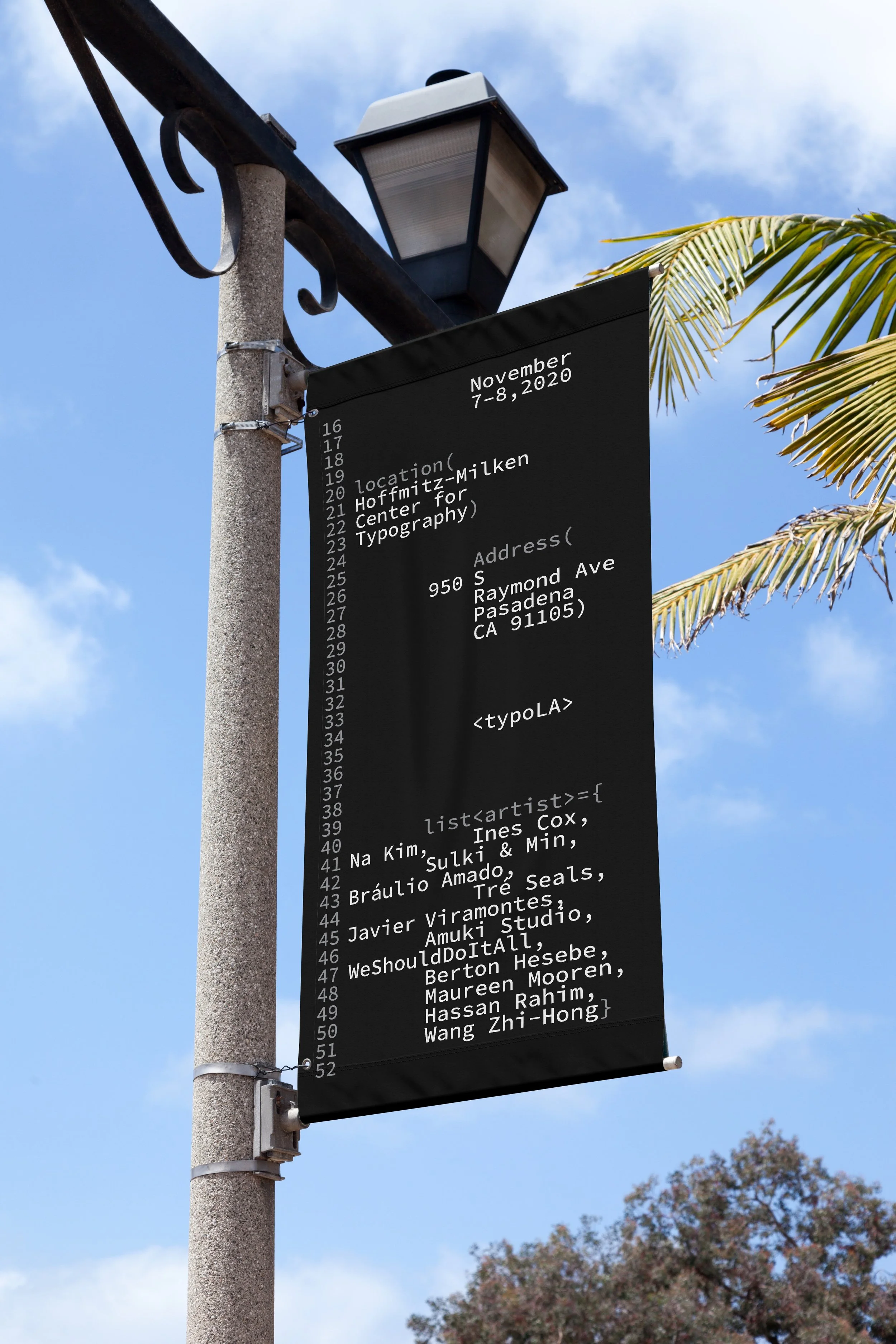 For this project, we were tasked to create an identity system for TypoLA, a typographic convention. With that in mind, The design language that was chosen for this project would be language based on coding. Since 2020 is the year of online learning, the intention of using coding as the design language emphasis on the digital form factor. Its simplistic style acts as a direct notion for online learning as well as the exploration towards educational typographic experimentation.